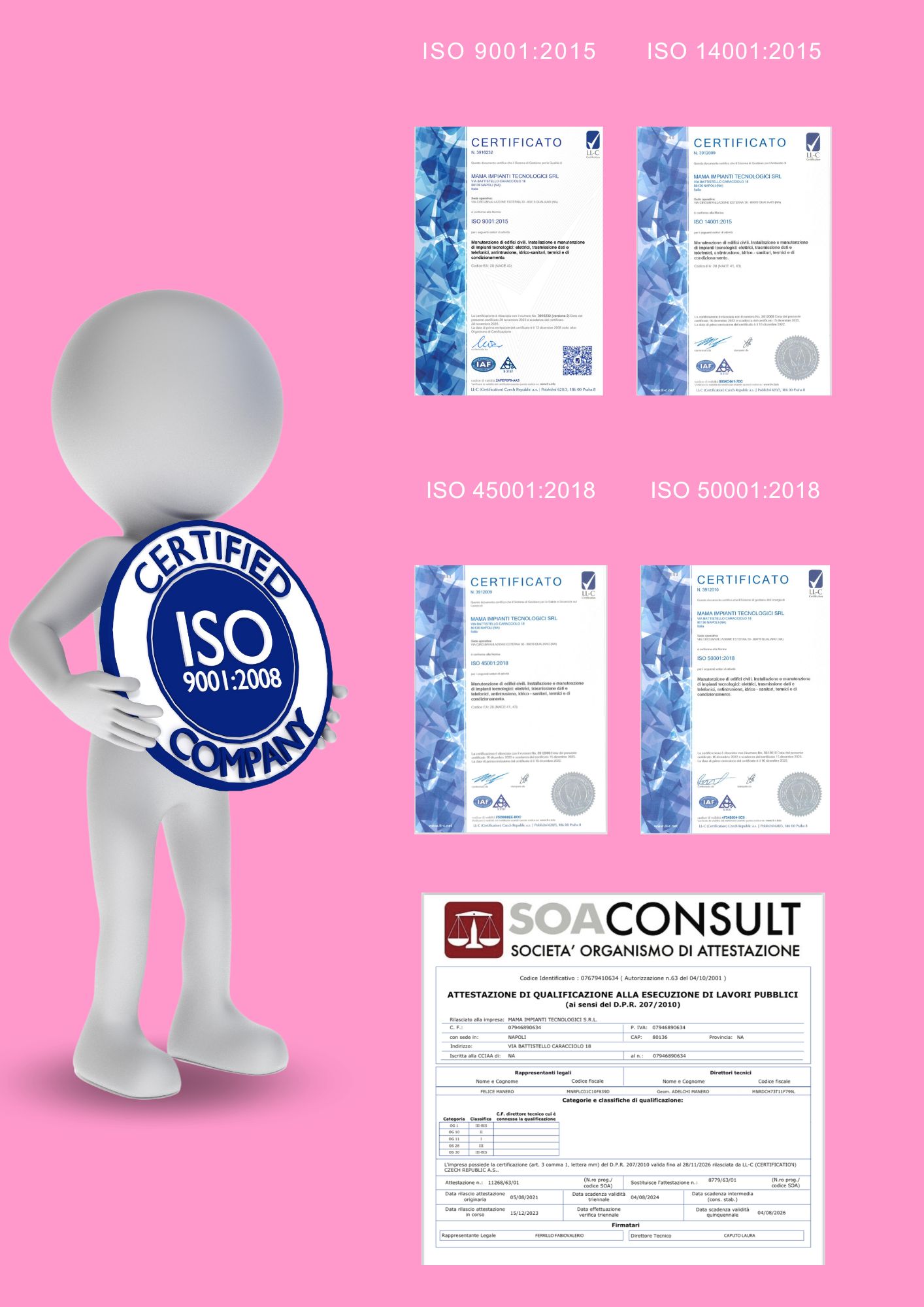 Inoltre è in possesso di Certificato di qualità ISO 9001:2015, e di attestazione SOA per le categorie: OG1 III bis – OS30 III bis – OG10 II – OS28 III -OG11 I